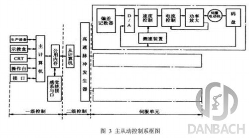 (2) 主從控制系統(tǒng)(Master-slave Control System):采用主、從兩處理器實現(xiàn)系統(tǒng)的全部控制功能。主CPU(上位機(jī))實現(xiàn)管理、坐標(biāo)變換、軌跡生成和系統(tǒng)自診斷等;從CPU(下位機(jī))實現(xiàn)所有關(guān)節(jié)的動作控制。其構(gòu)成框圖,如圖3所示。主從控制方式系統(tǒng)實時性較好,適于高精度、高速度控制,但其系統(tǒng)擴(kuò)展性較差,維修困難。