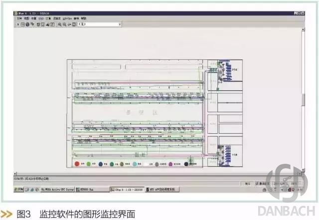 項(xiàng)目中的AGV系統(tǒng)具有完善的設(shè)備智能故障診斷功能。在AGV的運(yùn)行中如果出現(xiàn)故障,能通過AGV監(jiān)控系統(tǒng)查看AGV小車當(dāng)前的運(yùn)行狀態(tài)和運(yùn)行日志、讀取AGV小車的運(yùn)行黑匣子文件(BlackBox)、AGV小車上的人機(jī)交互設(shè)備(OPT10、OPT200等)等不同方式進(jìn)行設(shè)備的故障診斷。監(jiān)控軟件的圖形監(jiān)控界面,如圖3。AGV運(yùn)行過程中,從監(jiān)控軟件可以觀察到AGV的行駛狀態(tài),不同的顏色表示不同的狀態(tài)。