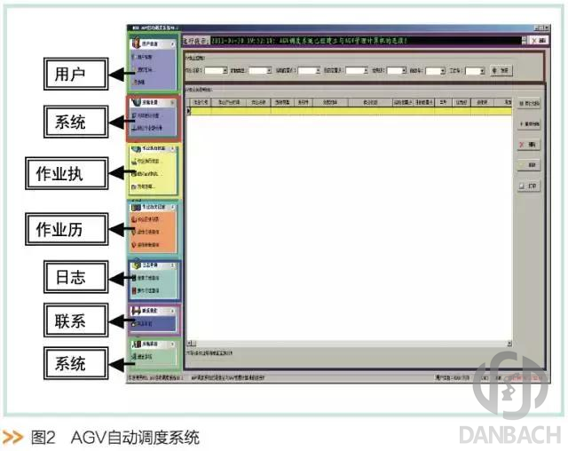 AGV自動調(diào)度系統(tǒng)(如圖2)是連接AGV系統(tǒng)和工廠生產(chǎn)系統(tǒng)MES、倉庫管理系統(tǒng)WMS等的接口軟件,AGV系統(tǒng)中的調(diào)度軟件具有當(dāng)前作業(yè)執(zhí)行狀態(tài)查詢、作業(yè)歷史記錄查詢、運(yùn)行日志查詢等功能,進(jìn)行AGV系統(tǒng)和各相關(guān)系統(tǒng)的信息交互和物料信息的自動跟蹤。